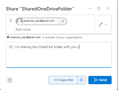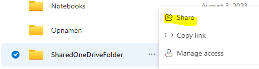 In het onderstaande voorbeeld wordt een map met de naam 'SharedOneDriveFolder' gedeeld met een externe gebruiker: