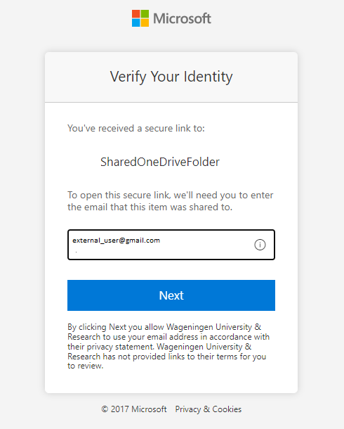 Opmerking: als het opgegeven e-mailadres bekend is bij Microsoft, is het hierna beschreven gedeelte met de verificatiecode niet van toepassing; na het opgeven van het e-mailadres wordt de gebruiker rechtstreeks naar de gedeelde OneDrive-locatie gestuurd.