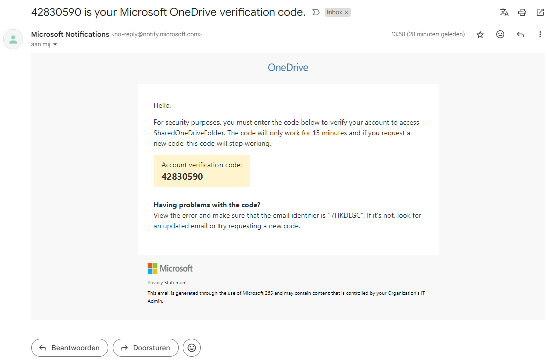 - Als het externe adres NIET bekend is bij Microsoft, krijgt de externe gebruiker na verificatie van het e-mailadres een verificatiecode toegestuurd die hij moet invoeren in het verificatievenster. Na het invoeren van deze code wordt de gebruiker doorgestuurd naar de gedeelde locatie.
