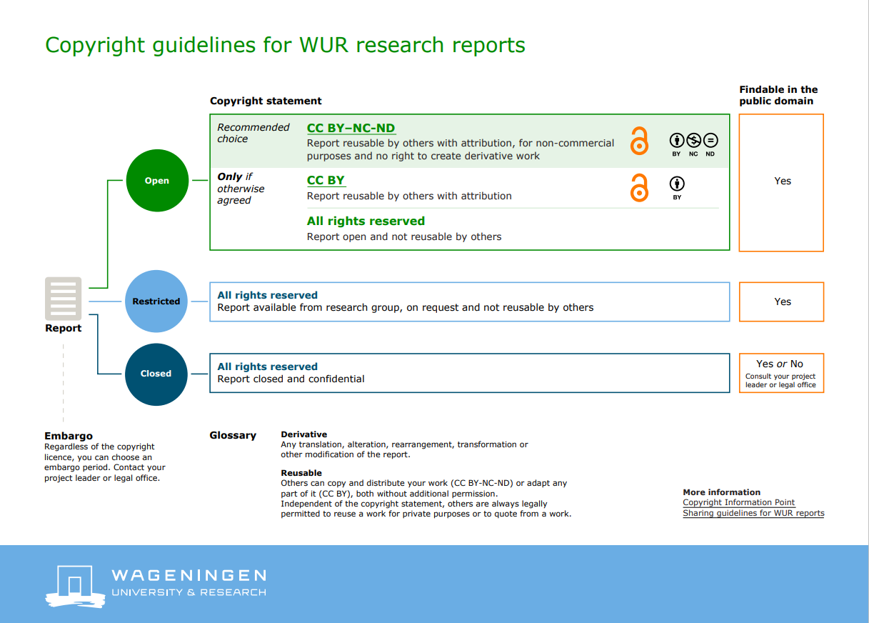 WUR has developed guidelines for copyright licences for WUR Reports. The recommended choice is CC BY–NC-ND. If otherwise agreed, other copyright choices are also allowed. There is a flowchart available to guide you to the correct copyright choice for your WUR report.